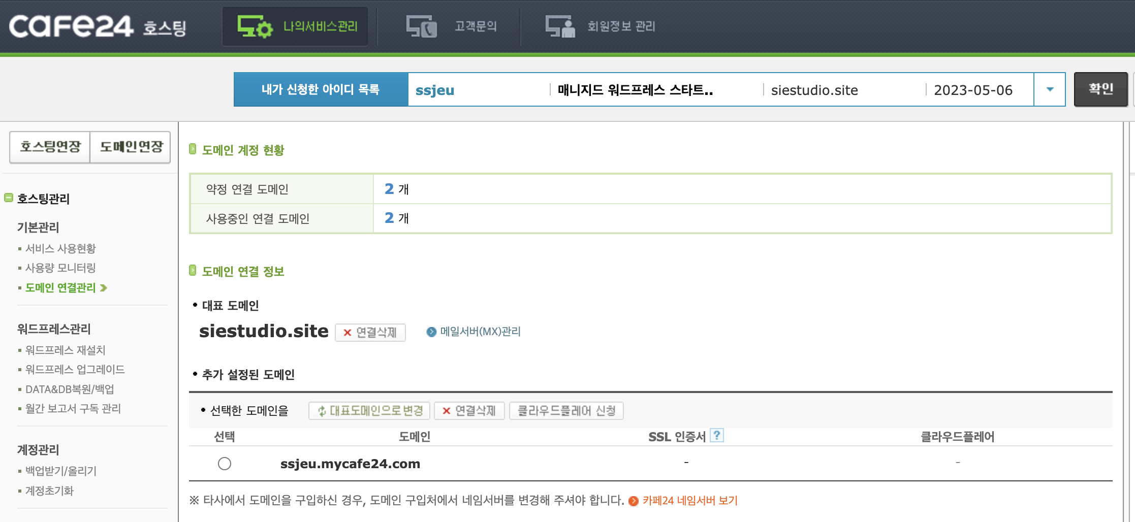 - cafe24 → 구입한 도메인 주소 연결, 해당 도메인 대표 도메인으로 변경